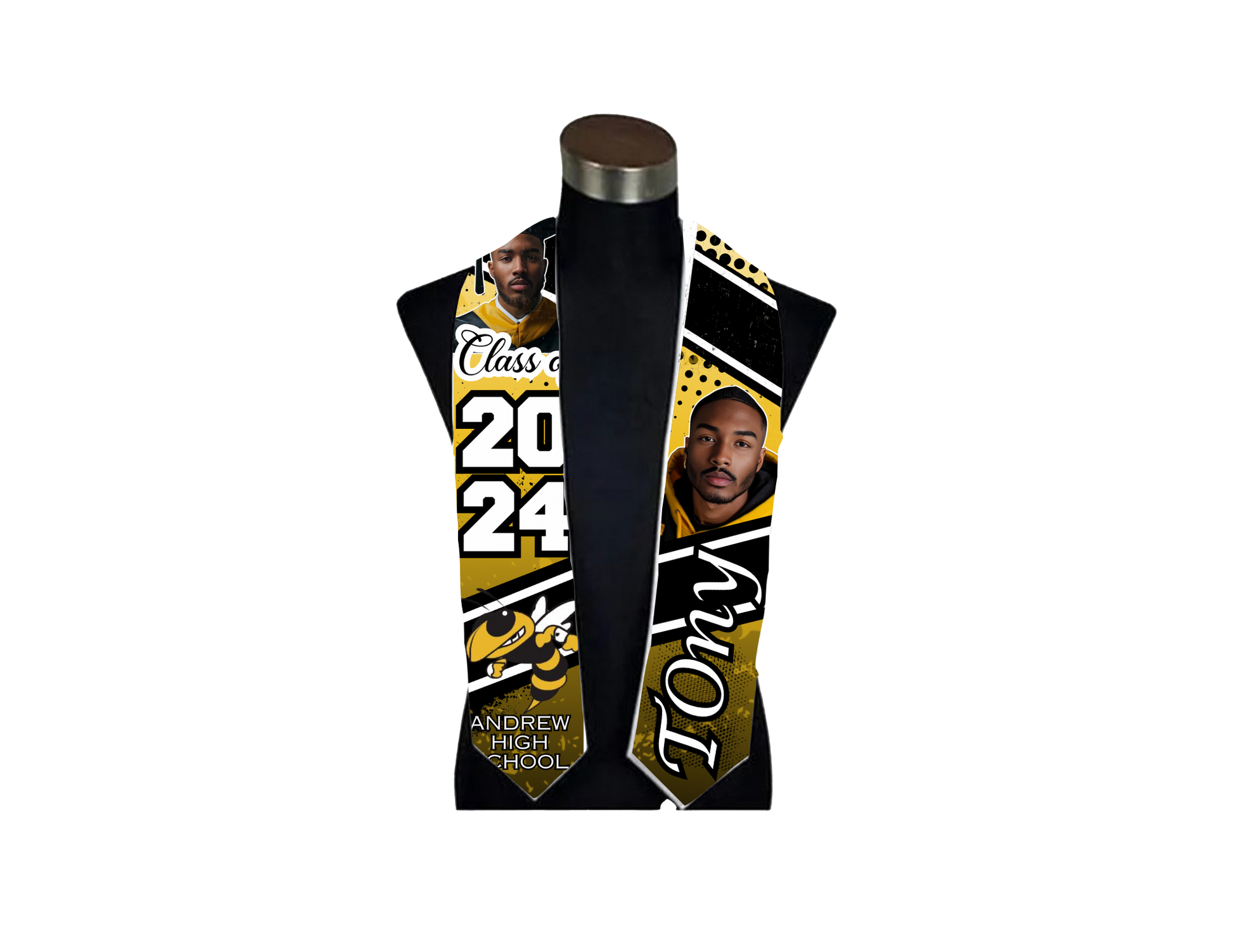 Celebrate your big day with our Custom Graduation Stole! Personalize it with your school's colors and symbols for a truly unique and memorable accessory. Look and feel confident as you walk across the stage to receive your diploma. Make your graduation even more special with our one-of-a-kind stole!