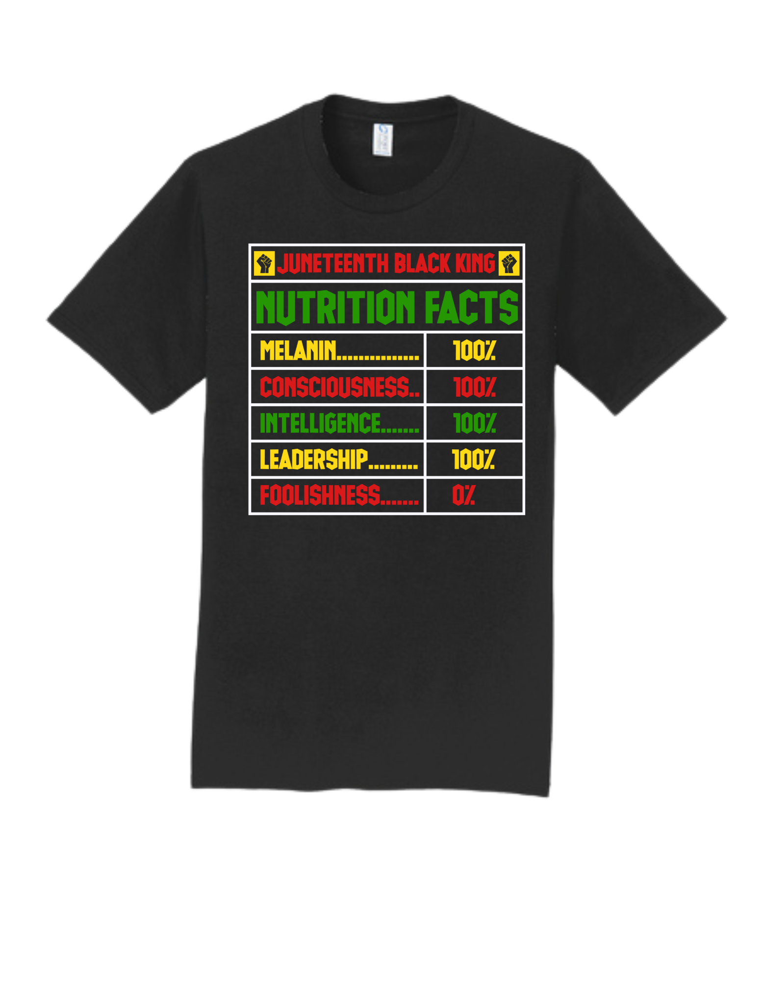 Celebrate freedom with the Juneteenth Nutrition Facts Black King t-shirt. This bold and motivating t-shirt features a unique design that showcases the essential nutrients needed for a life of adventure and taking risks. Wear it proudly and inspire others to embrace their boldness and challenge the status quo!